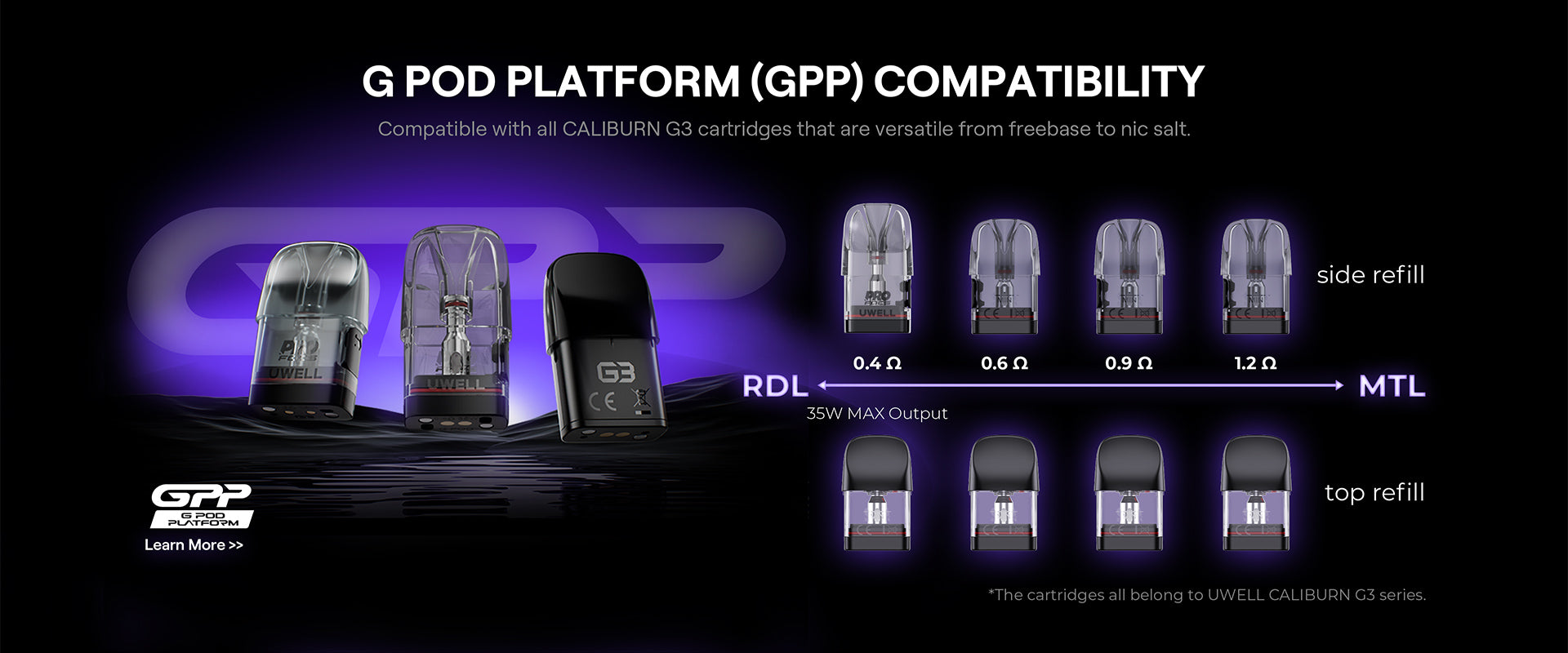 • 1 x 0.4ohm CALIBURN G3 Cartridge 3ml (side fill)