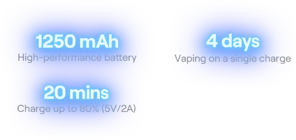 4 days vaping on a single charge, 20 mins charge up to 80% (5V/2A)